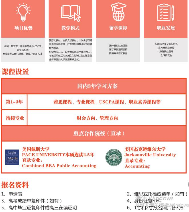 采用会计教育与美国注册会计师教育相互融合的模式,利用国际教育资源,创新国际化人才培养,学生完成国内阶段课程考试,可衔接国外大学,获得国外本科学位。